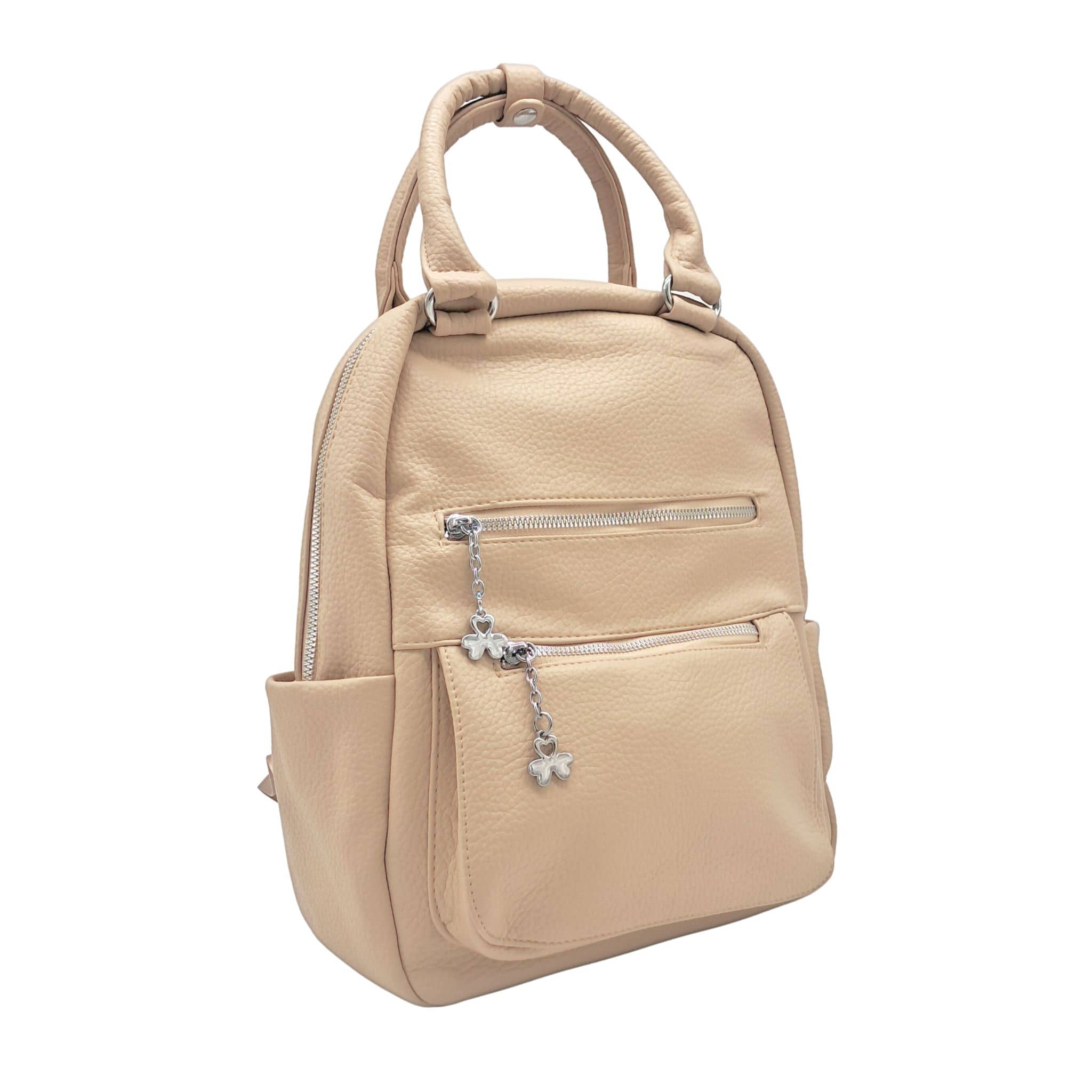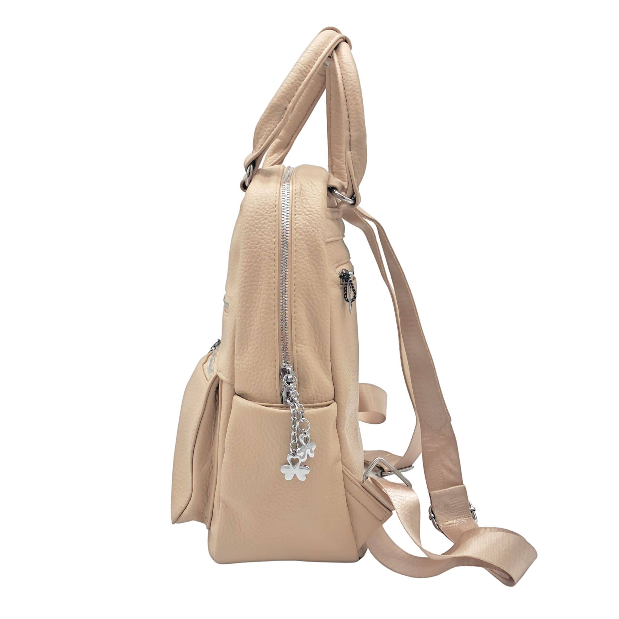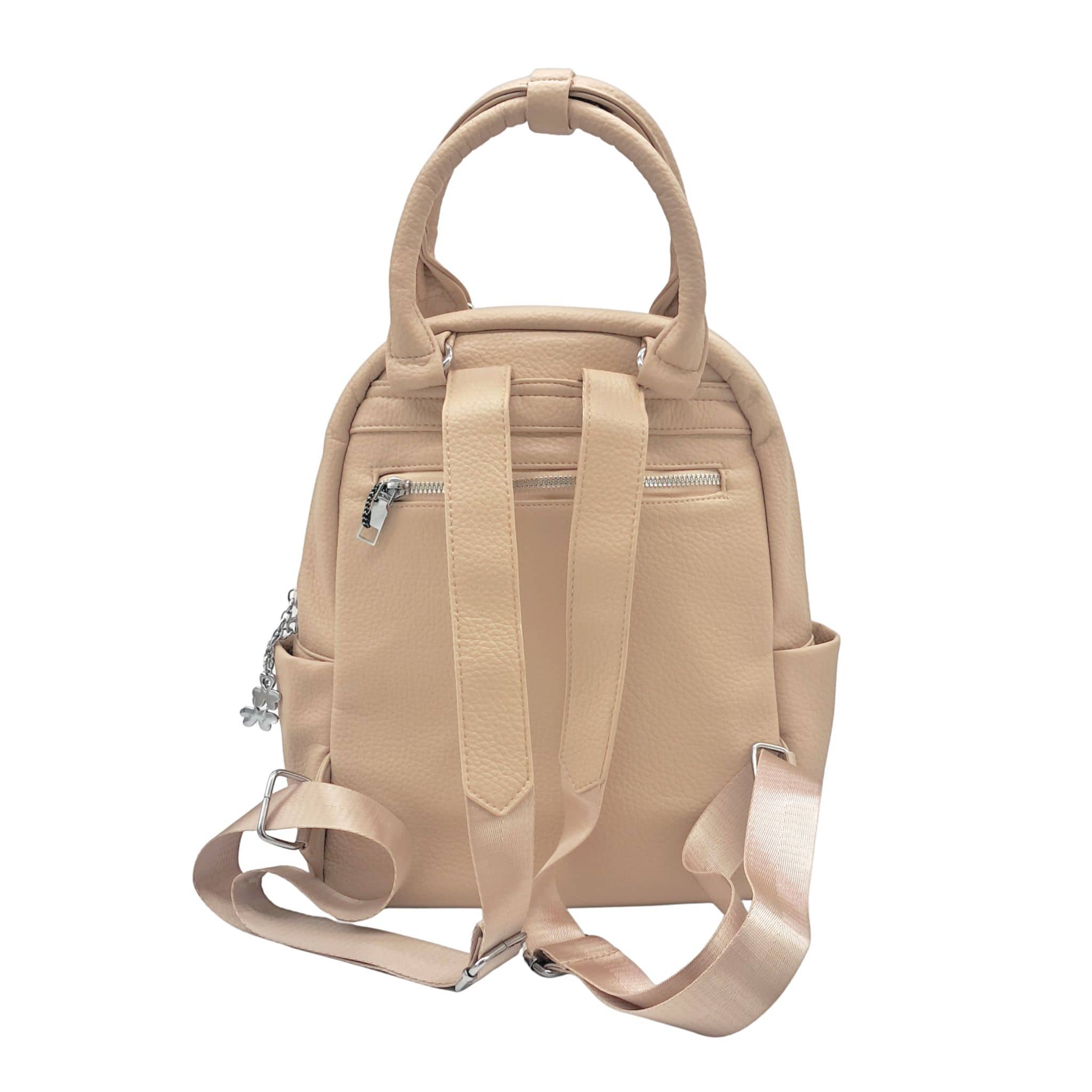 Plecak ma kolor beżowy w odcieniu khaki ze srebrnymi okuciami, dlatego idealnie pasuje do wiosennych i letnich stylizacji. Suwaki znajdujące się przy przednich kieszonkach plecaka oraz przy komorze głównej zostały dodatkowo ozdobione srebrnymi koniczynkami, co nadaje im lekkości i uroku.