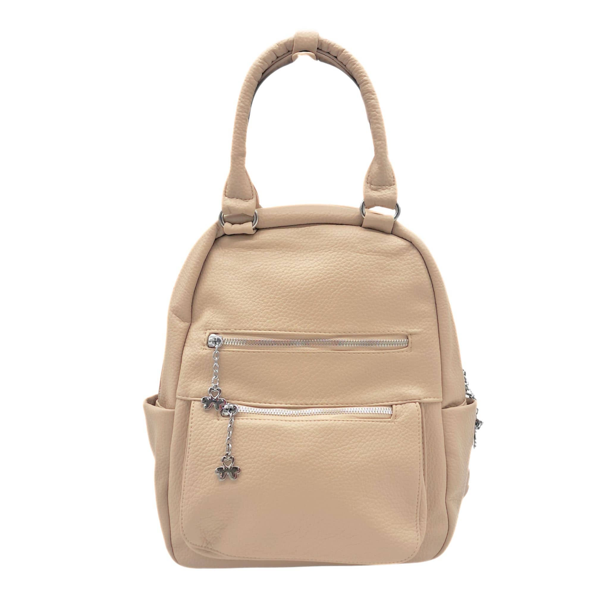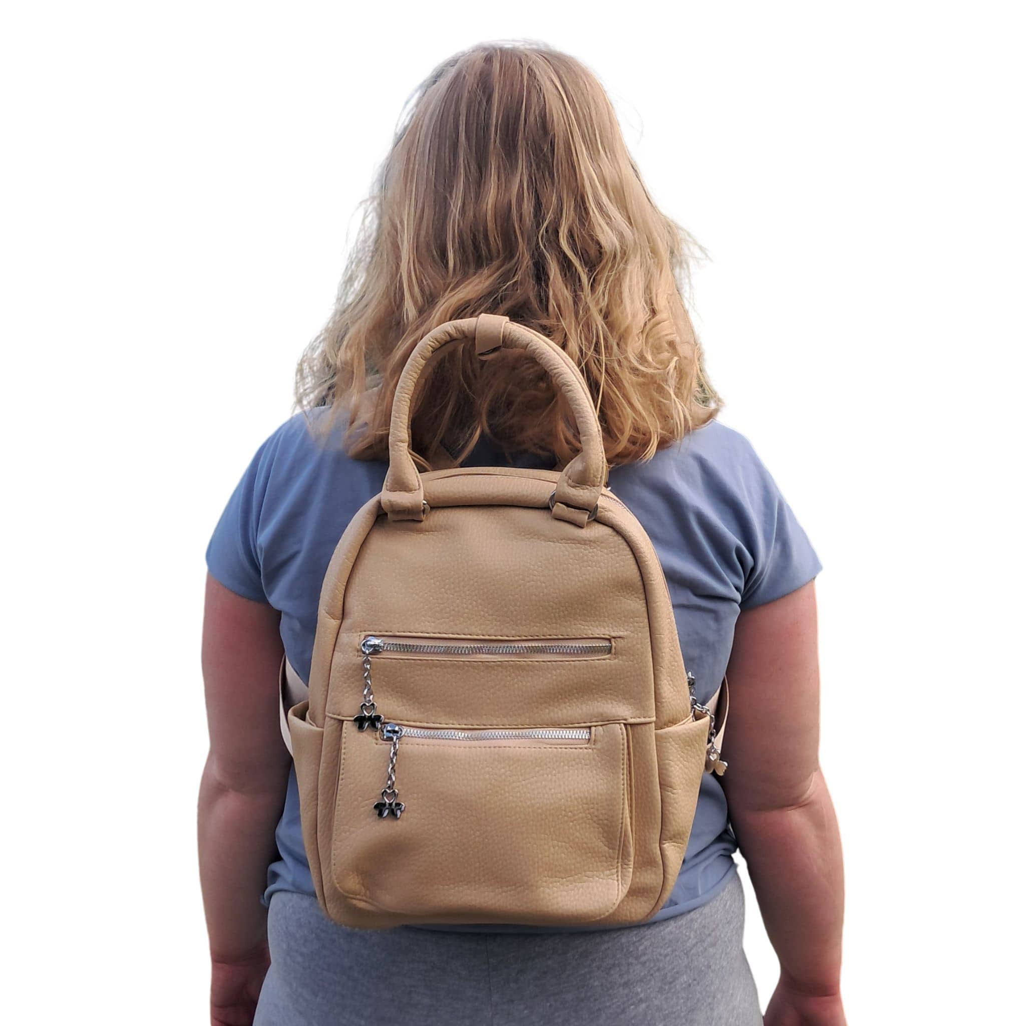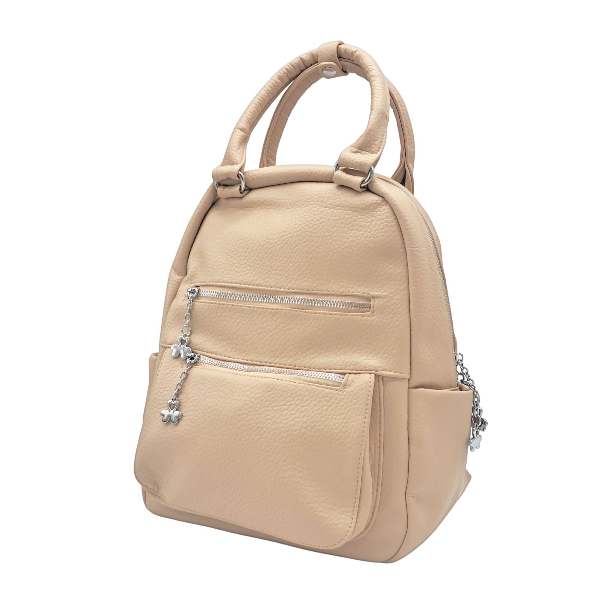 Plecak ma kolor beżowy w odcieniu khaki ze srebrnymi okuciami, dlatego idealnie pasuje do wiosennych i letnich stylizacji. Suwaki znajdujące się przy przednich kieszonkach plecaka oraz przy komorze głównej zostały dodatkowo ozdobione srebrnymi koniczynkami, co nadaje im lekkości i uroku.