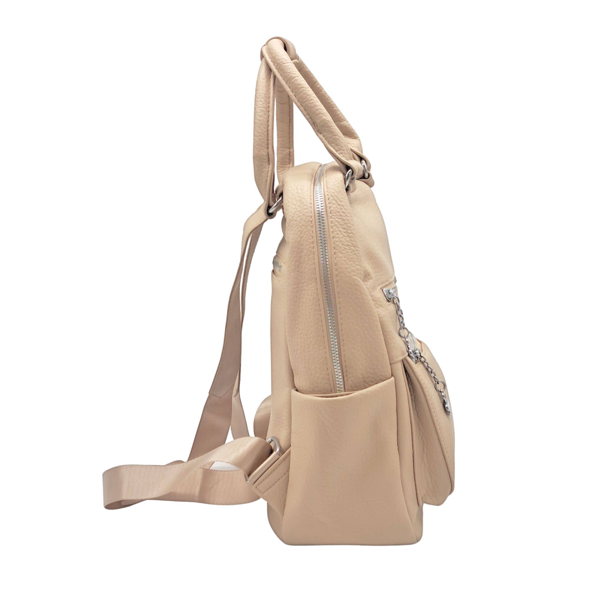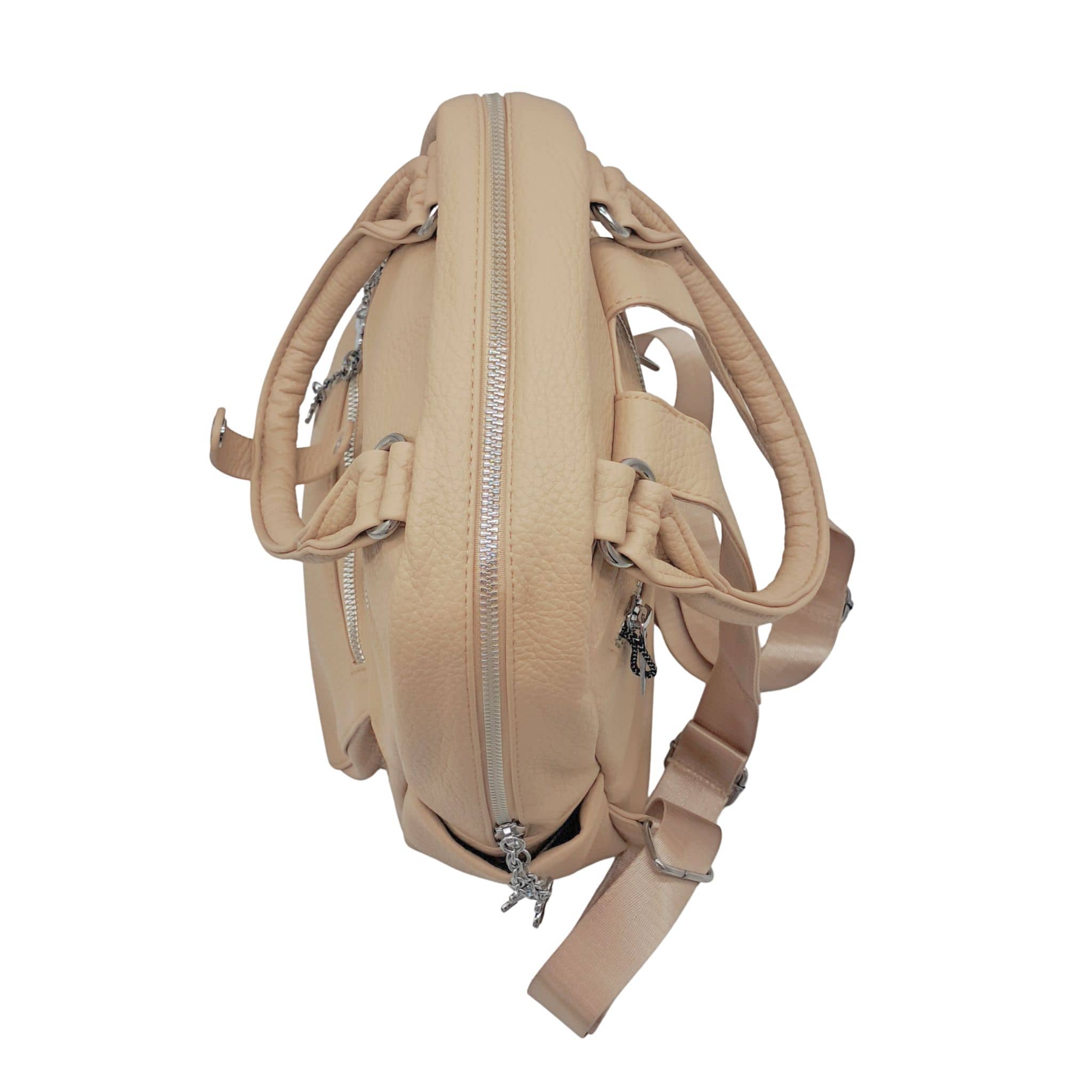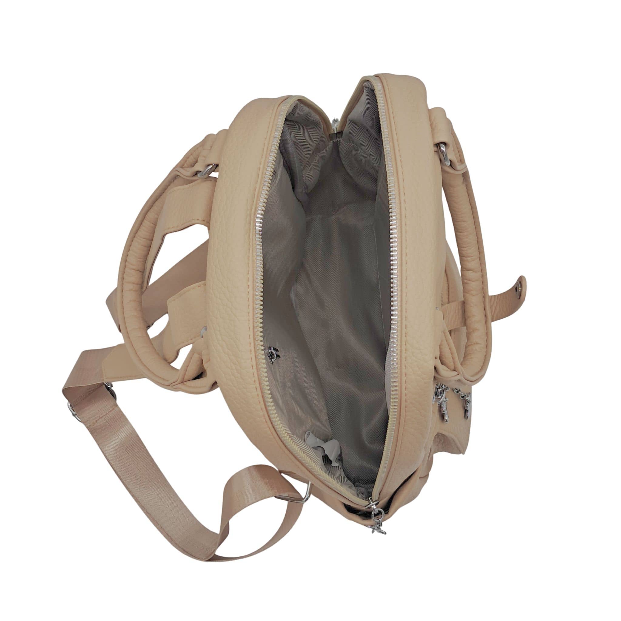 Plecak posiada dwa szerokie ramiączka wykonane ze skóry ekologicznej oraz taśmy. Szelki mają regulowaną długość, co umożliwia dopasowanie plecaka do każdej sylwetki. U góry plecaka znajdują się dwa wygodne uchwyty do noszenia w dłoni – można je spiąć na zatrzask.