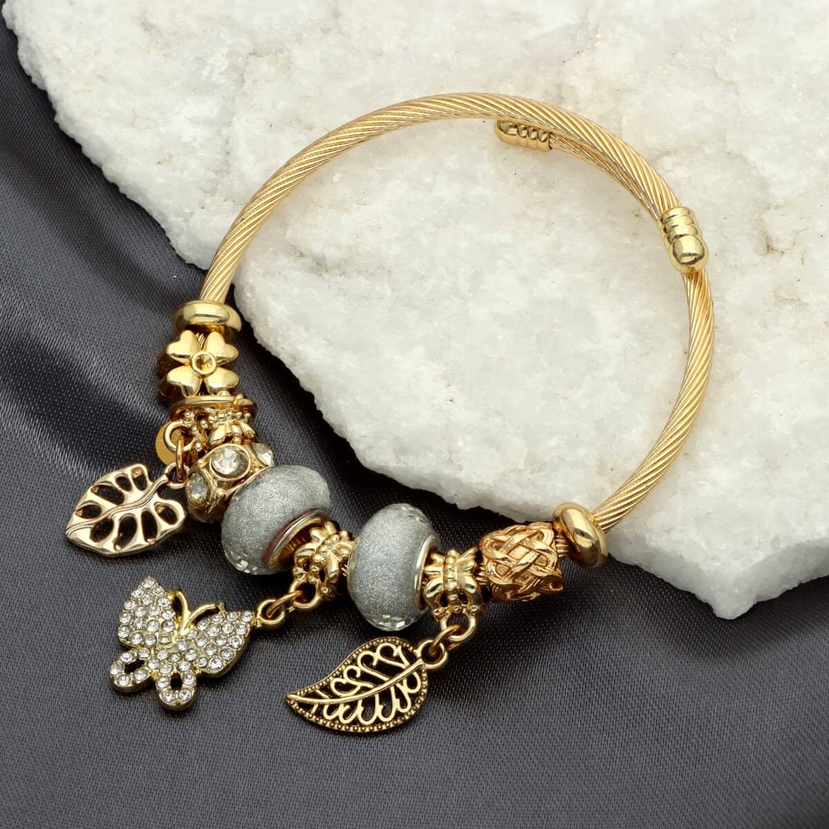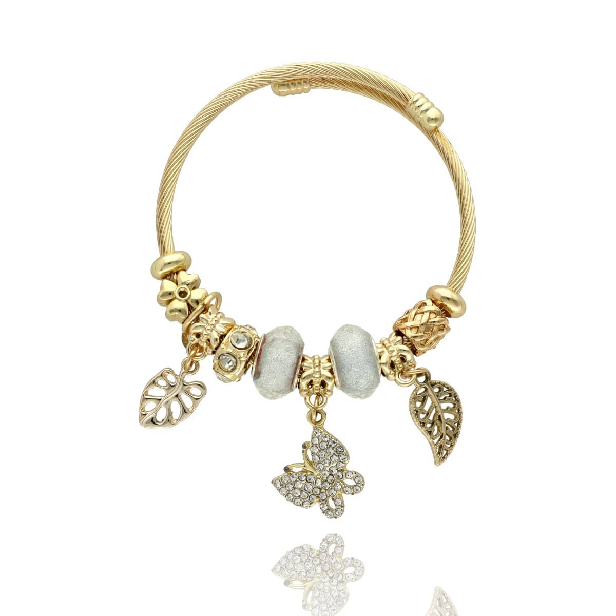 Bransoletka Yvon B98284 to urocza propozycja dla każdej kobiety. Została wykonana ze stali szlachetnej (obręcz) oraz zamaku, szkła fasetowanego, ceramiki i emalii (charmsy). Posiada zawieszkę w kształcie motyla oraz liści. W bransoletce dominuje kolor złoty, ale posiada także srebrne koraliki.