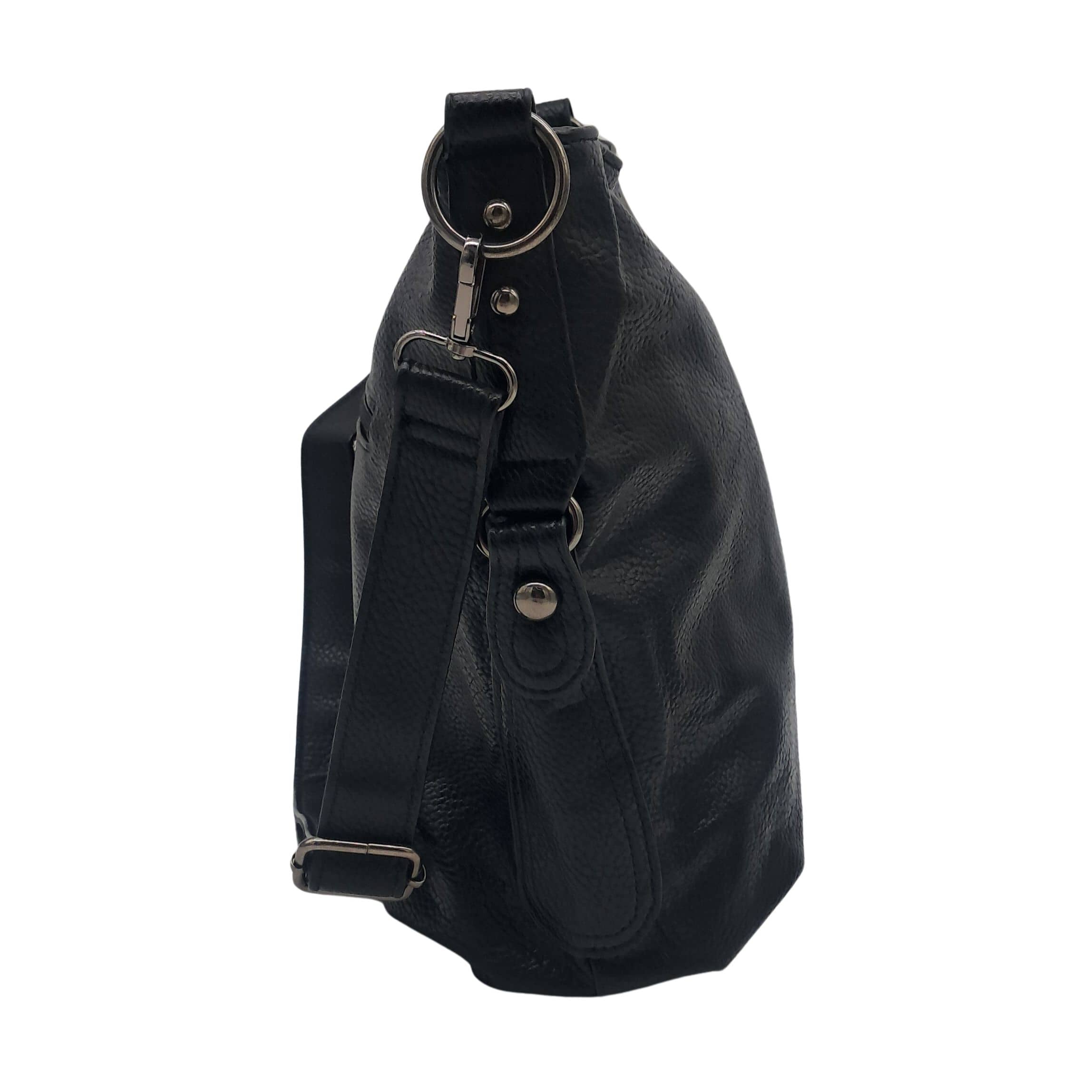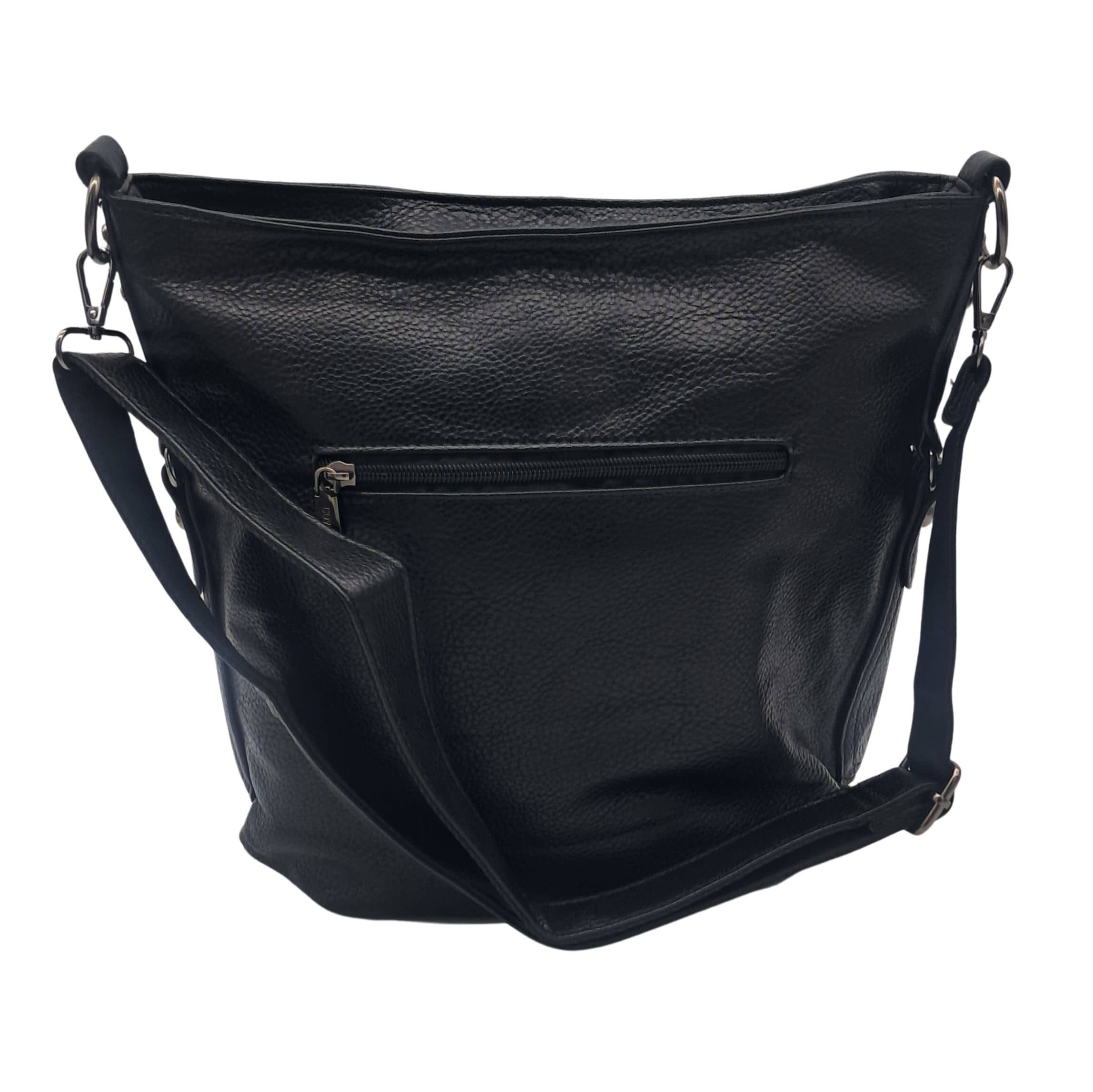 Czarna torebka damska z ekoskóry to elegancki i funkcjonalny dodatek do codziennych stylizacji. Wykonana z wysokiej jakości skóry ekologicznej, łączy trwałość z nowoczesnym designem. Torebka mieści format A5, dzięki czemu idealnie sprawdzi się do przenoszenia notesów, tabletów czy dokumentów.