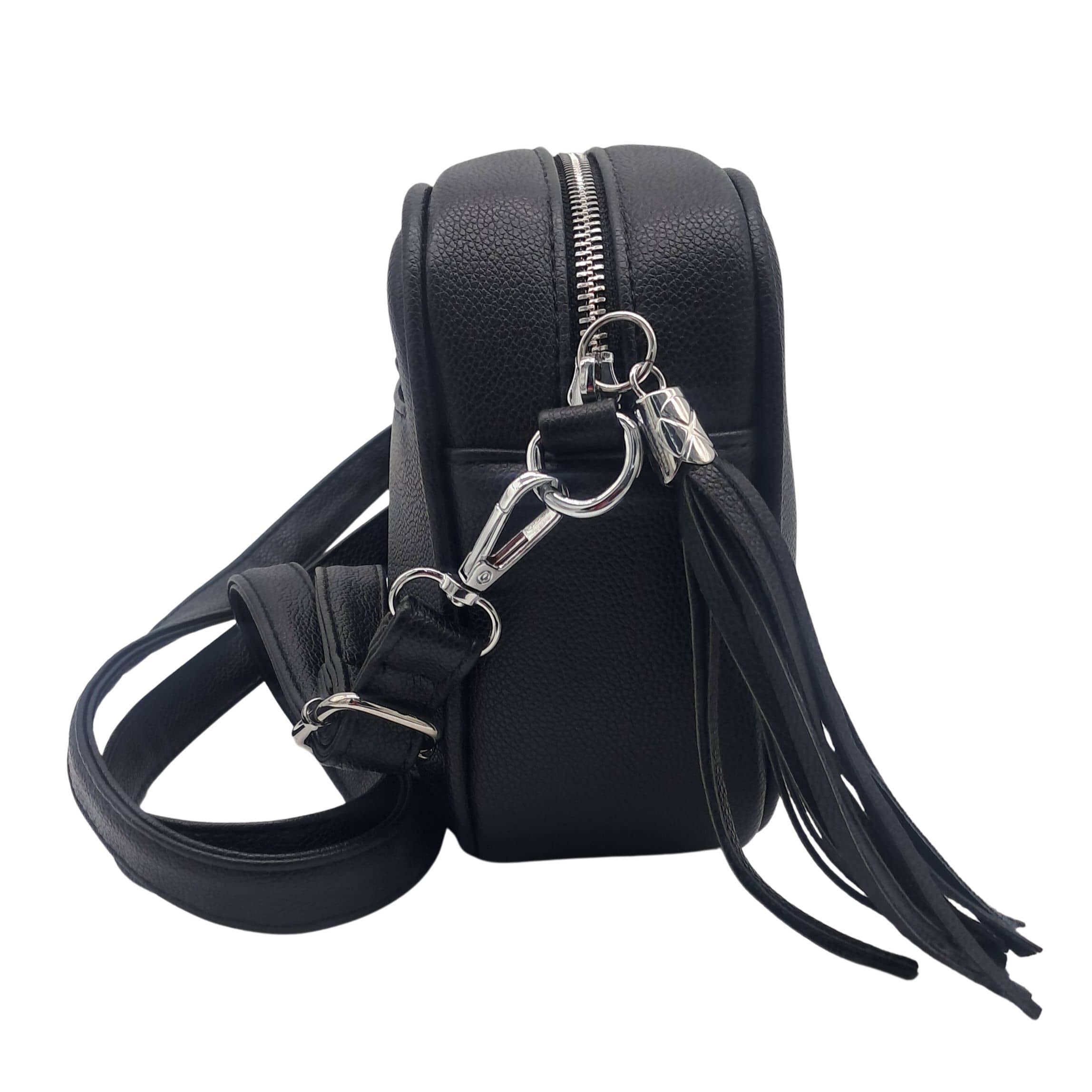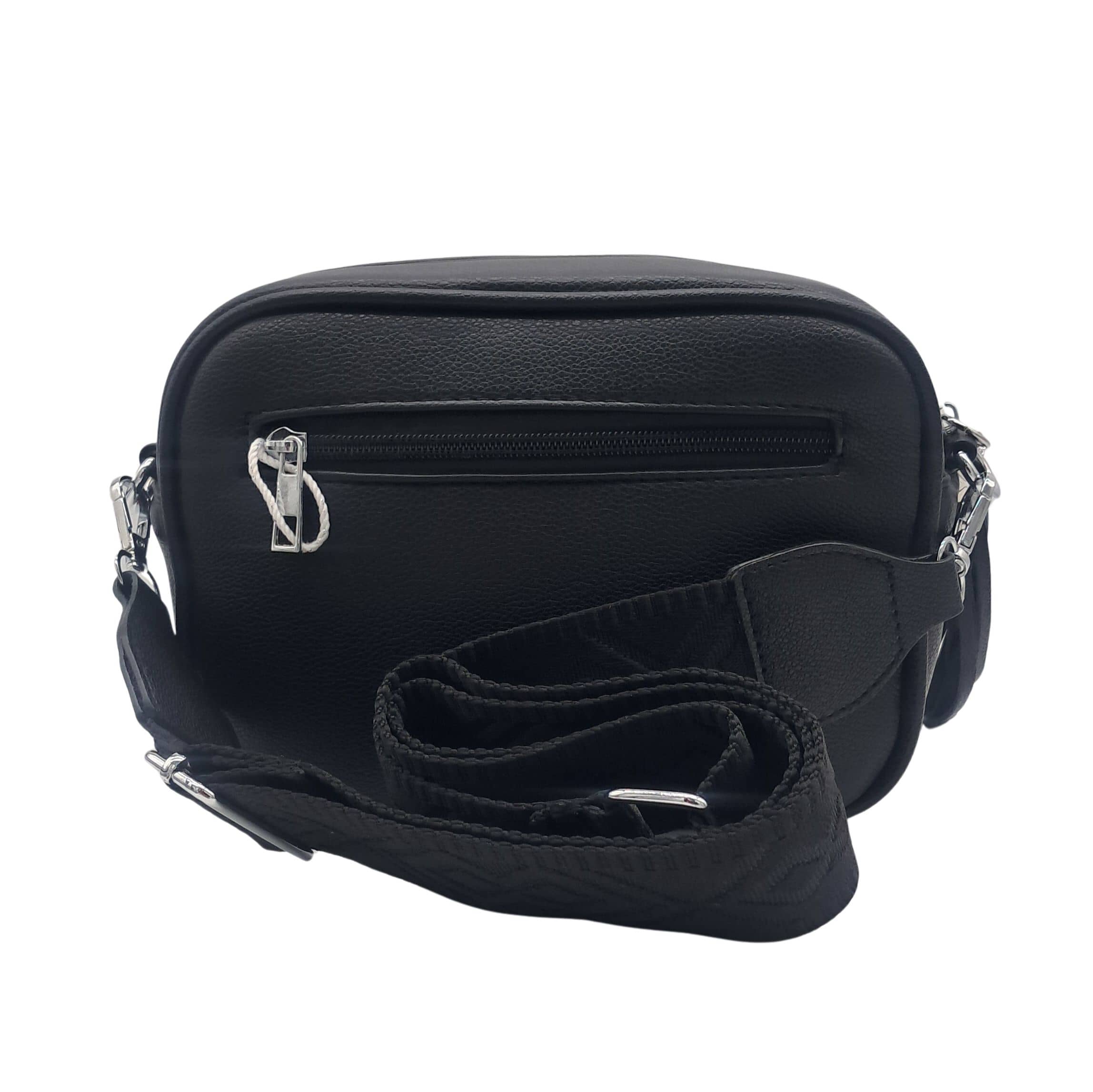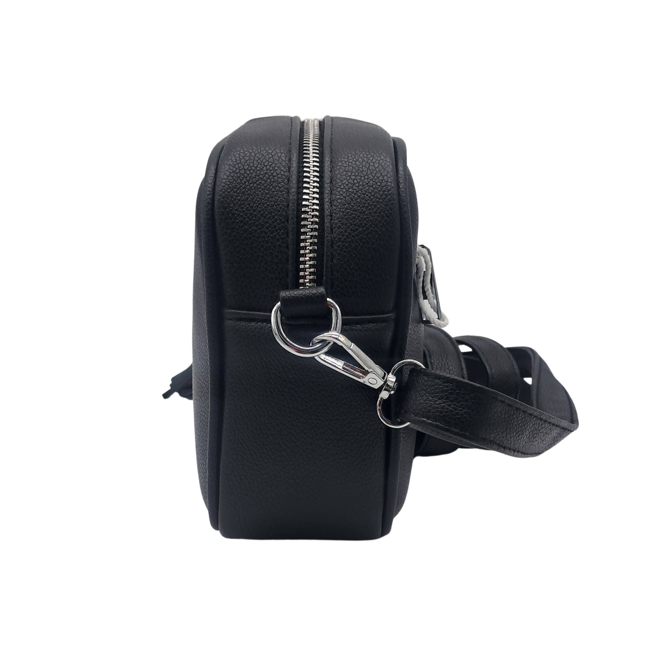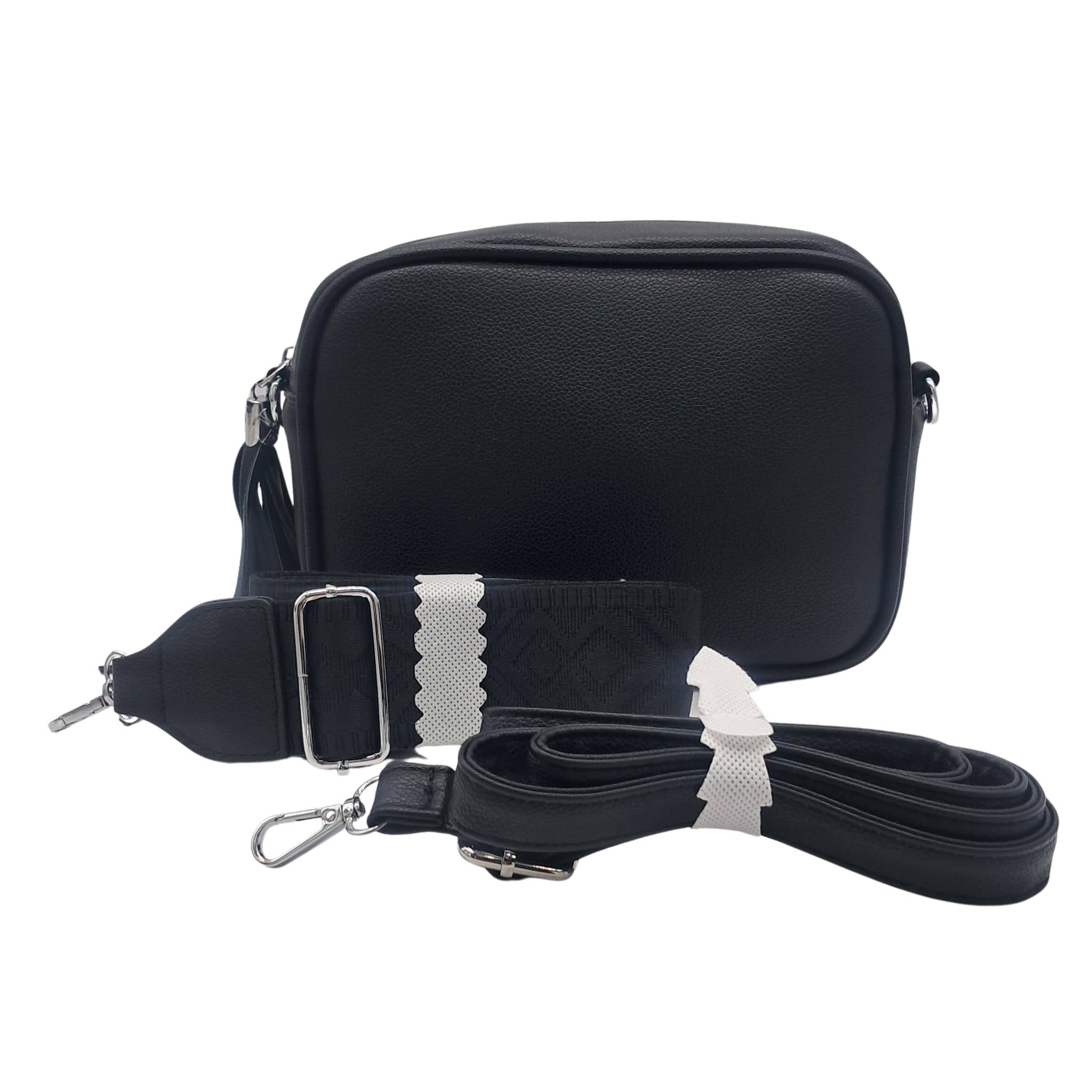 Model wyposażony jest w dwa wymienne paski – szeroki, czarny pasek parciany zapewniający komfort noszenia na co dzień oraz wąski pasek ze skóry ekologicznej, idealny do bardziej eleganckich stylizacji. Srebrne okucia podkreślają nowoczesny charakter i dodają torebce subtelnej elegancji.