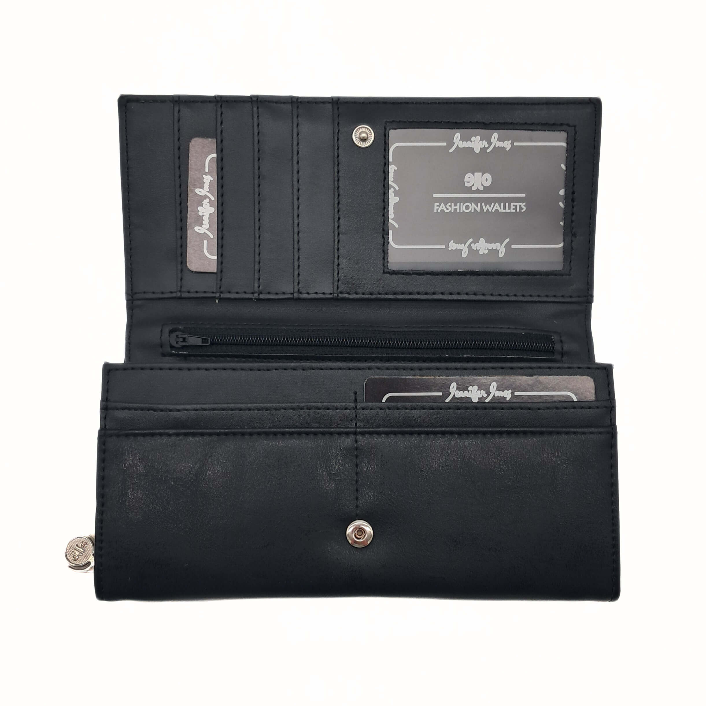 Portfel damski Jennifer Jones 1109-7 został wykonany z wysokiej jakości miękkiej skóry ekologicznej w cieniowanym czarnym kolorze. Posiada 3 pojemne komory, w tym jedną na monety na suwak oraz 8 miejsc na karty. Ma również miejsce na zdjęcie. Portfel zamyka się na zatrzask.