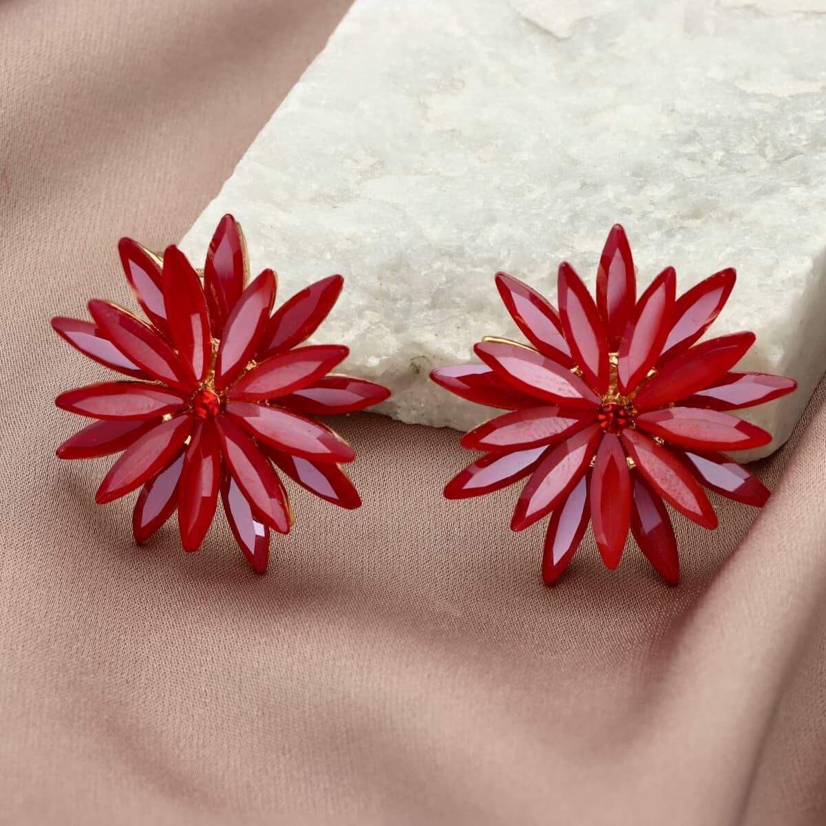 Kolczyki te posiadają zapięcie na sztyft. Zostały wykonane z metalu antyalergicznego (ZAMAK), bezpiecznego dla wrażliwej skóry, oraz szkła fasetowanego w kolorze czerwonym. Biżuteria jest antyalergiczna. Długość kolczyków to ok. 3 cm.