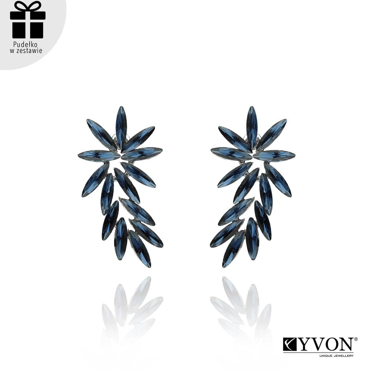 Kolczyki te posiadają zapięcie na sztyft. Zostały wykonane z metalu antyalergicznego w srebrnym kolorze, stali szlachetnej (sztyfty) oraz szkła fasetowanego w granatowym kolorze. Biżuteria jest antyalergiczna. Długość kolczyków to ok. 5 cm.