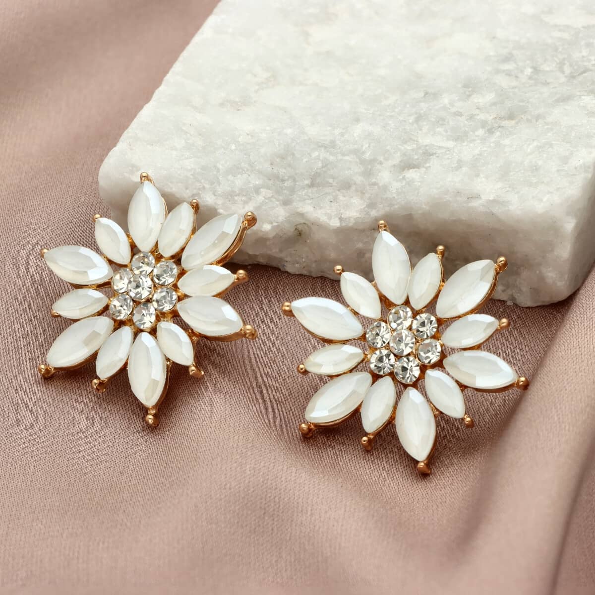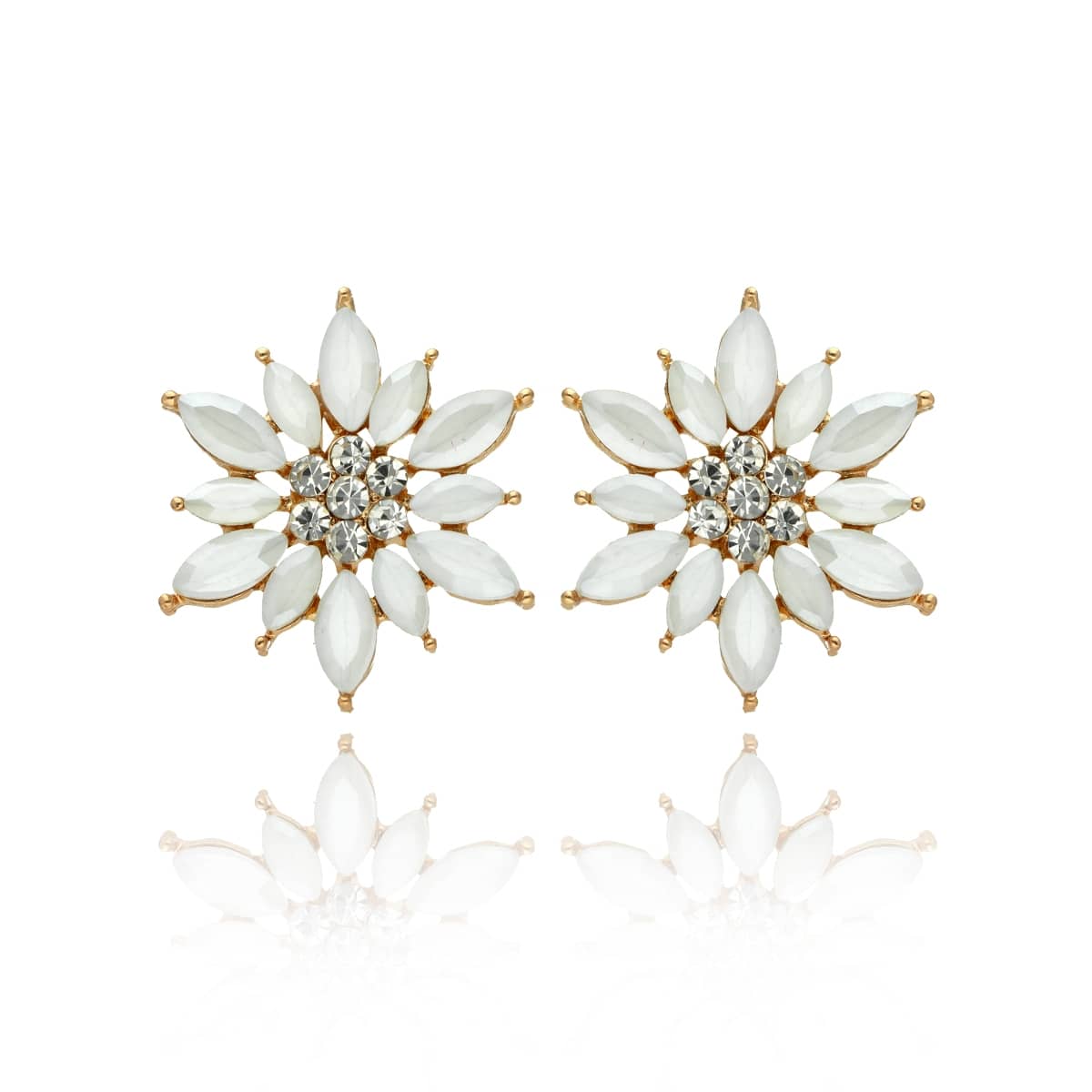 Kolczyki te posiadają zapięcie na sztyft. Zostały wykonane z metalu antyalergicznego o złotym kolorze (ZAMAK), bezpiecznego dla wrażliwej skóry, oraz szkła fasetowanego w kolorze białym. Biżuteria jest antyalergiczna. Długość kolczyków to ok. 2,5 cm.