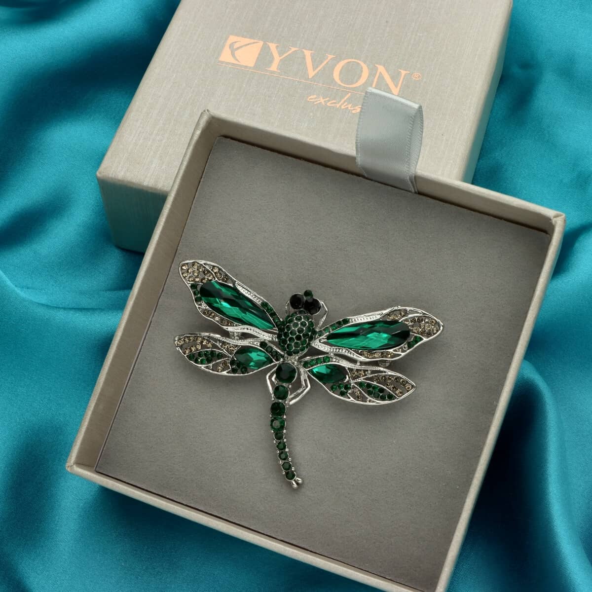 Niebieska broszka Yvon w kształcie ważki pakowana jest w eleganckie jubilerskie pudełeczko.