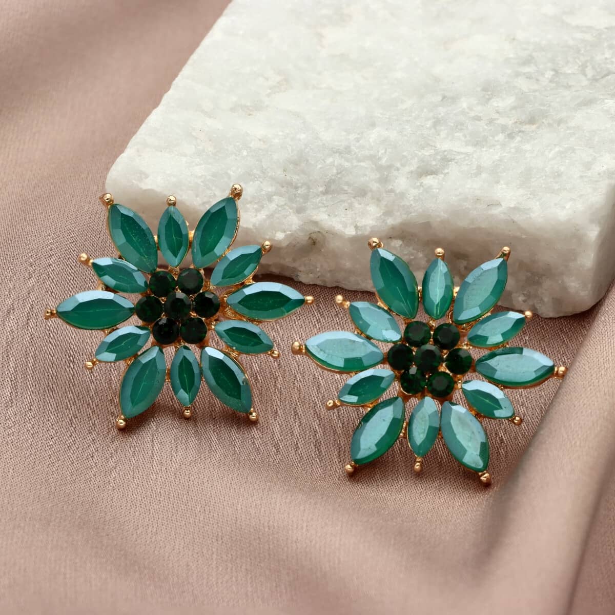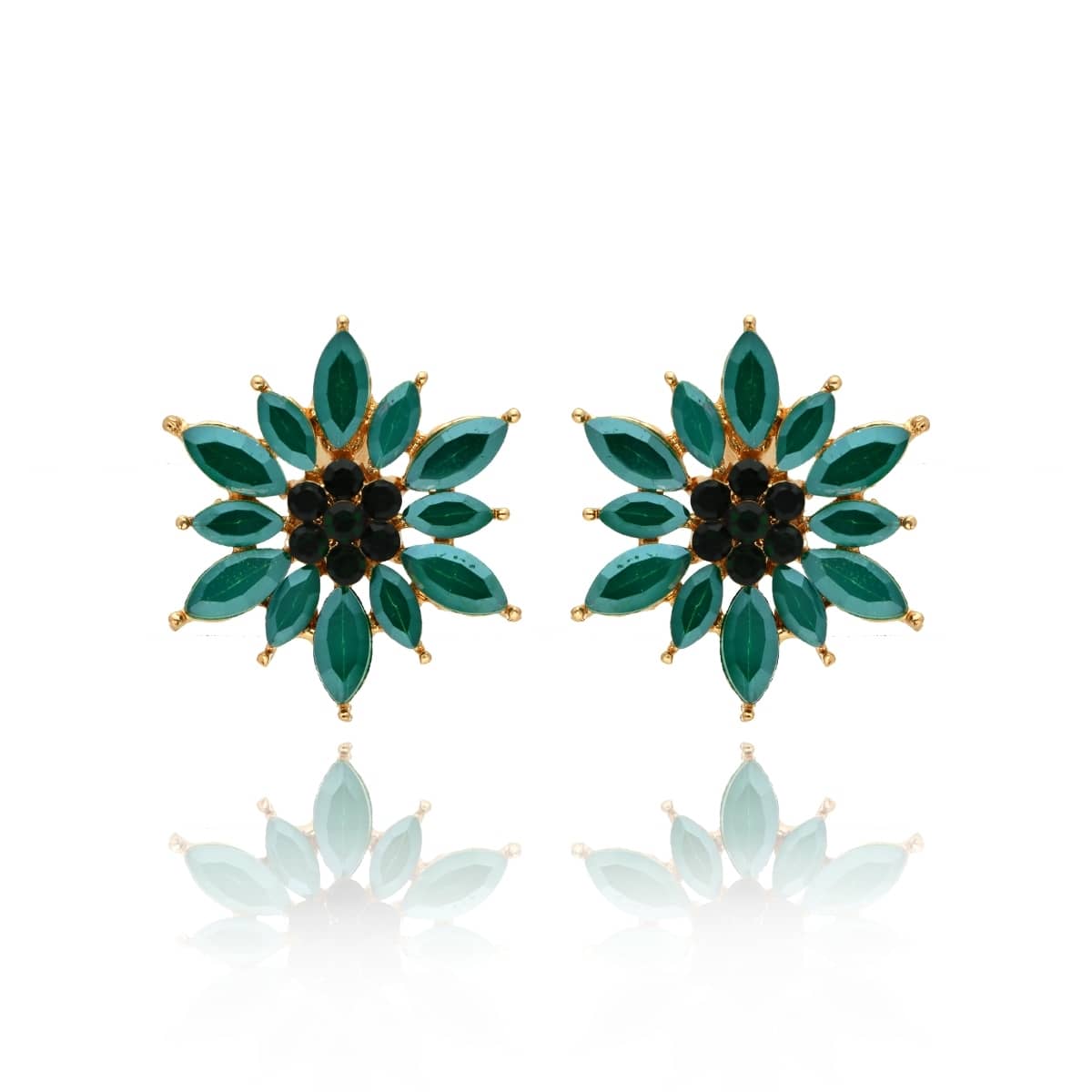 Kolczyki te posiadają zapięcie na sztyft. Zostały wykonane z metalu antyalergicznego o złotym kolorze (ZAMAK), bezpiecznego dla wrażliwej skóry, oraz szkła fasetowanego w zielonym kolorze. Biżuteria jest antyalergiczna. Długość kolczyków to ok. 2,5 cm.